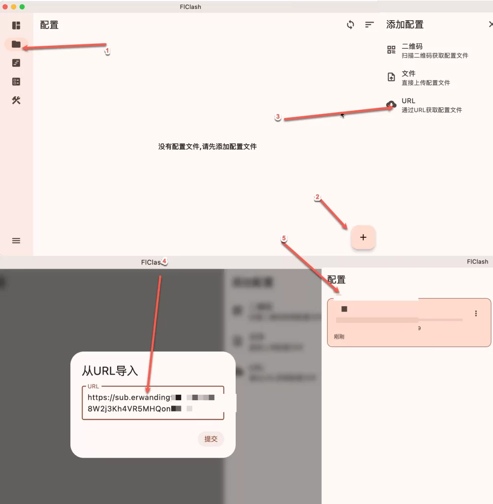 - 启动 FlClash,点击左侧菜单栏的 “配置 (Profiles)”。