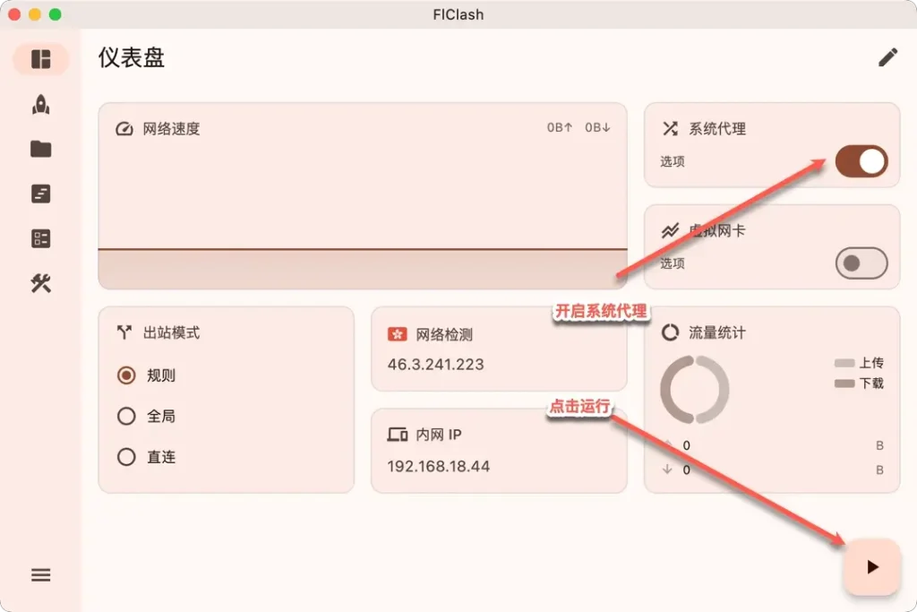 - 确保已经开启了“系统代理”开关并点击了右下角的运行按钮。